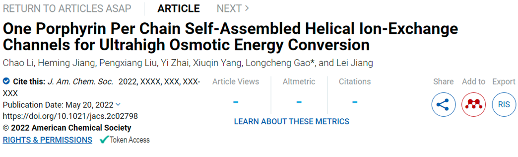2022年5月20日,Journal of the American Chemical Society 在线发表了公司江雷院士、高龙成副教授团队在高效离子交换膜方面的最新研究成果:“One Porphyrin Per Chain Self-Assembled Helical Ion-Exchange Channels for Ultrahigh Osmotic Energy Conversion”。yl23455永利集团博士生李超为第一作者,高龙成副教授为通讯作者,yl23455永利集团为第一单位。