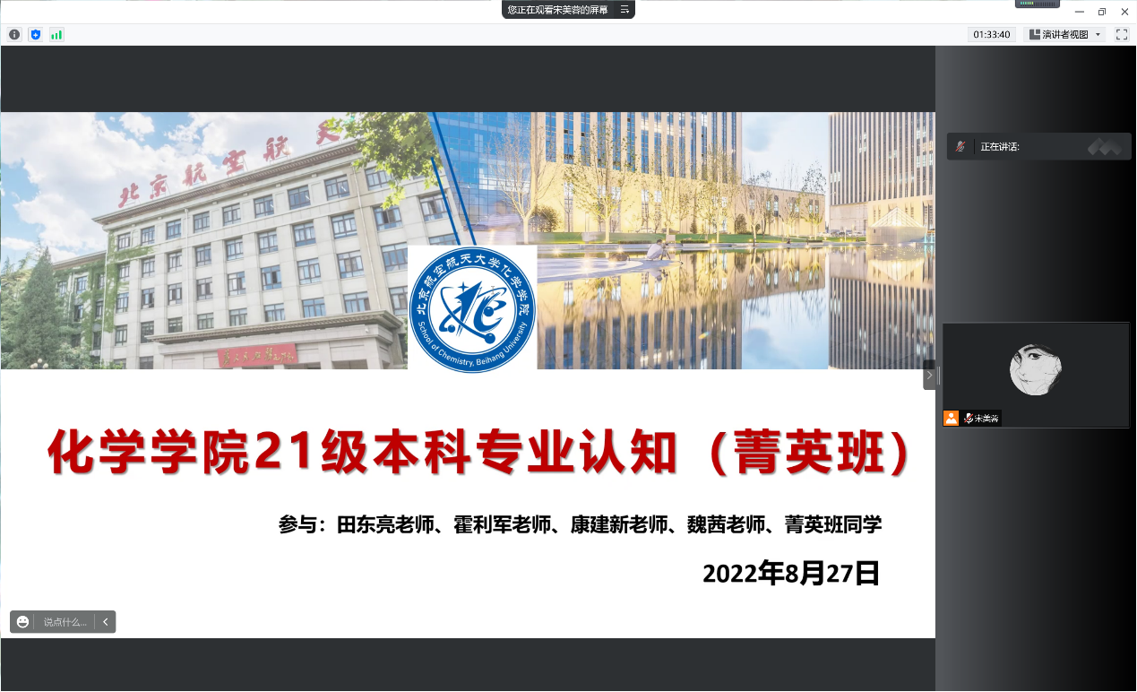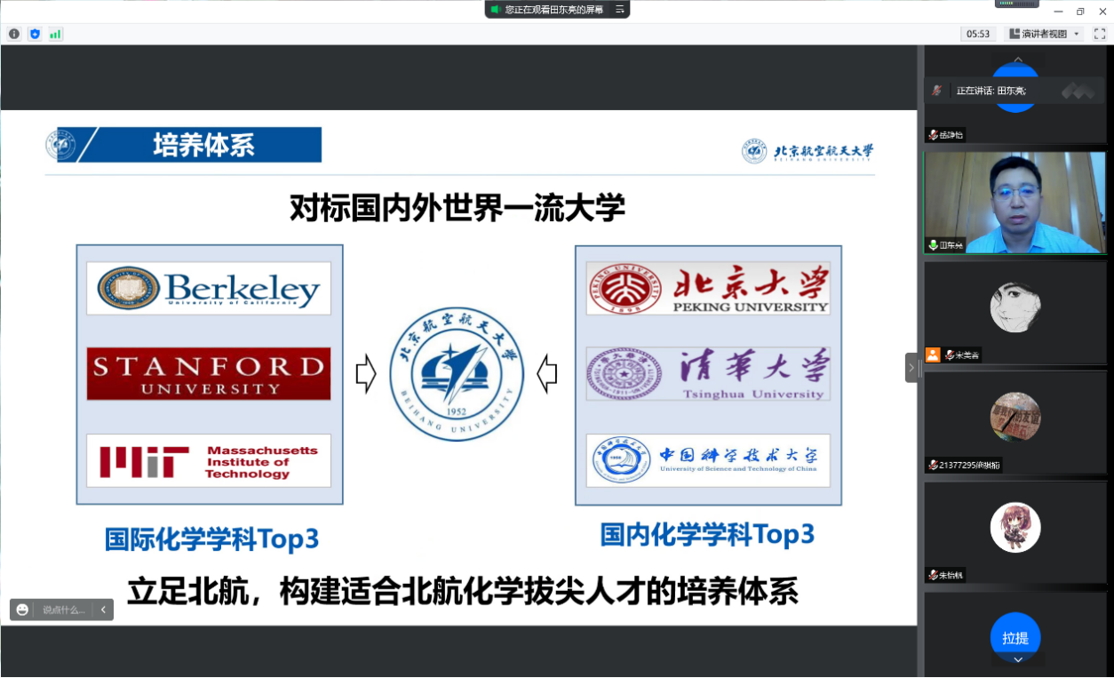 8月28日,yl23455永利集团2021级菁英班开展系列专业认知教育活动。上午9:00,专业认知大会以腾讯会议的形式召开。本科教学副经理田东亮老师、化员工物学专业负责人霍利军老师、应用化学系康建新老师、院团委书记魏茜老师与菁英班全体同学参加了此次会议。