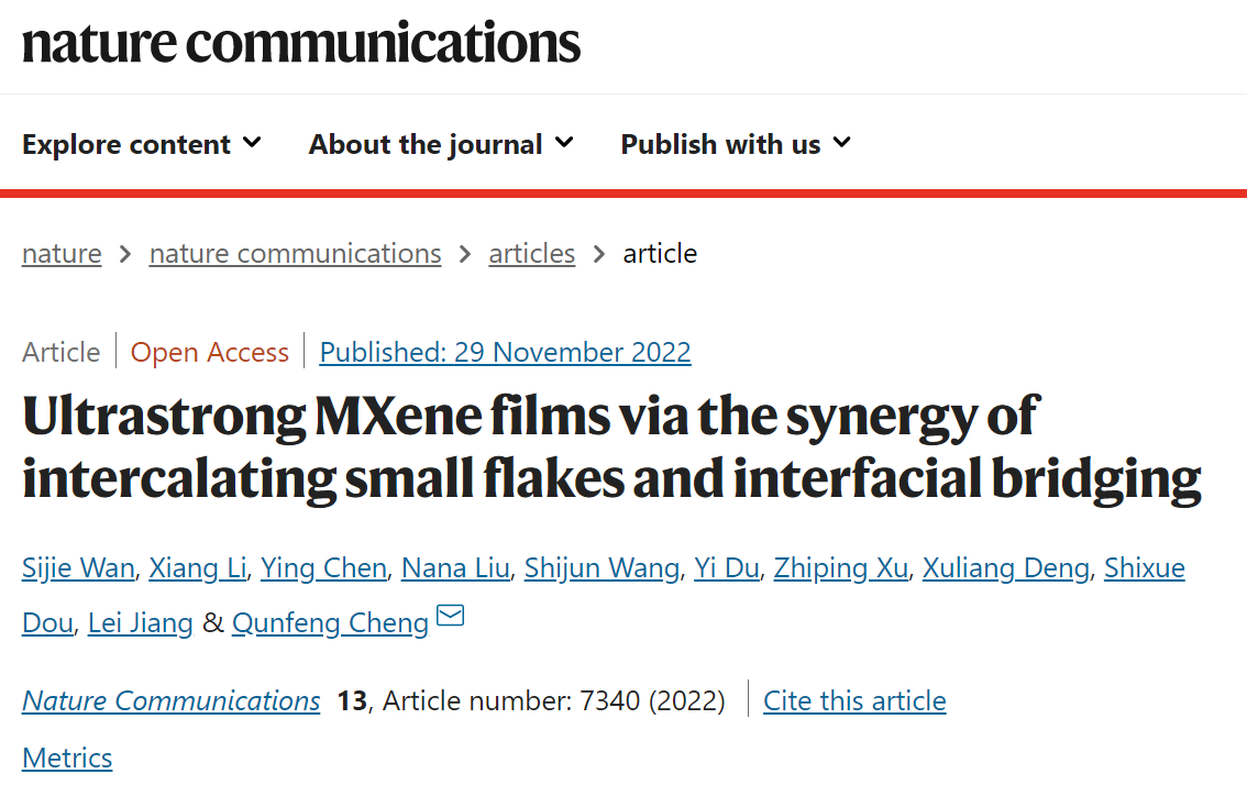 2022年11月29日,《Nature Communications》在线刊登了公司yl23455永利集团程群峰教授课题组的最新研究成果“小片填充和界面交联协同致密化的超强MXene薄膜”(英译:Ultrastrong MXene films via the synergy of intercalating small flakes and interfacial bridging),公司yl23455永利集团万思杰副教授、李响、北大口腔医院第一门诊部陈英博士、公司物理公司刘娜娜博士为第一作者,程群峰教授为通讯作者,yl23455永利集团为第一完成单位。