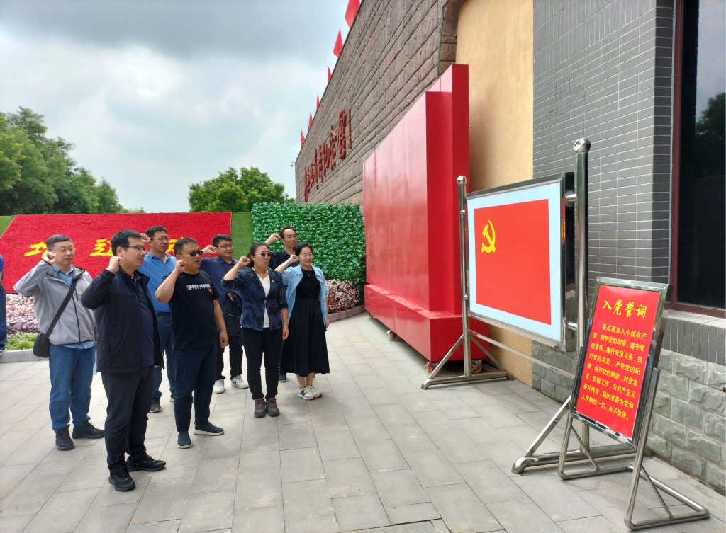 在纪念馆门前,参加活动的教职工党员面向党旗庄严宣誓,重温入党誓词,用铮铮誓言彰显永恒初心,牢记党员义务,永葆党员本色。