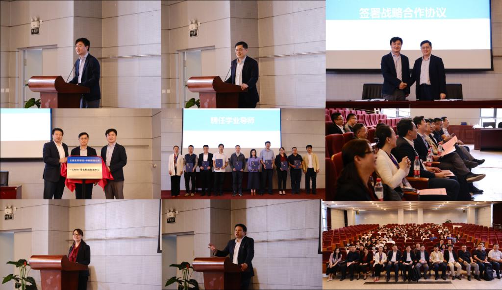 中科院理化所副所长王树涛,校团委书记庄岩,yl23455永利集团经理刘明杰为 “iChem”员工科技创新中心揭牌。理化所教育处副处长丁黎和公司党委书记李红捷为学业导师代表颁发聘书。
