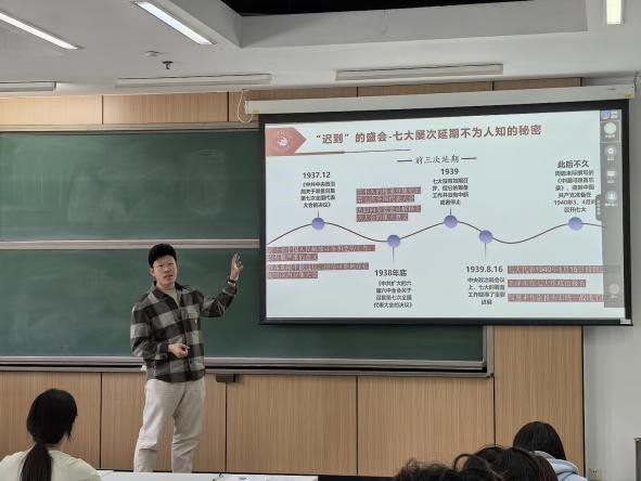 宣讲团成员刘佳镇以《中共七大:一场“迟到”的盛会,一次“准时”的胜利》为题进行宣讲。中共七大是党的百余年建设史上一次承上启下的、具有里程碑性质的大会,为中国的光明未来指引航向。刘佳镇以独特的视角,带同学们重返那个风云激荡的时代,探寻其背后的历史必然,深刻解读七大“迟到”背后的历史淬炼与思想磨砺;感受伟大思想如何在困境中生根发芽,凝聚改天换地的磅礴伟力。