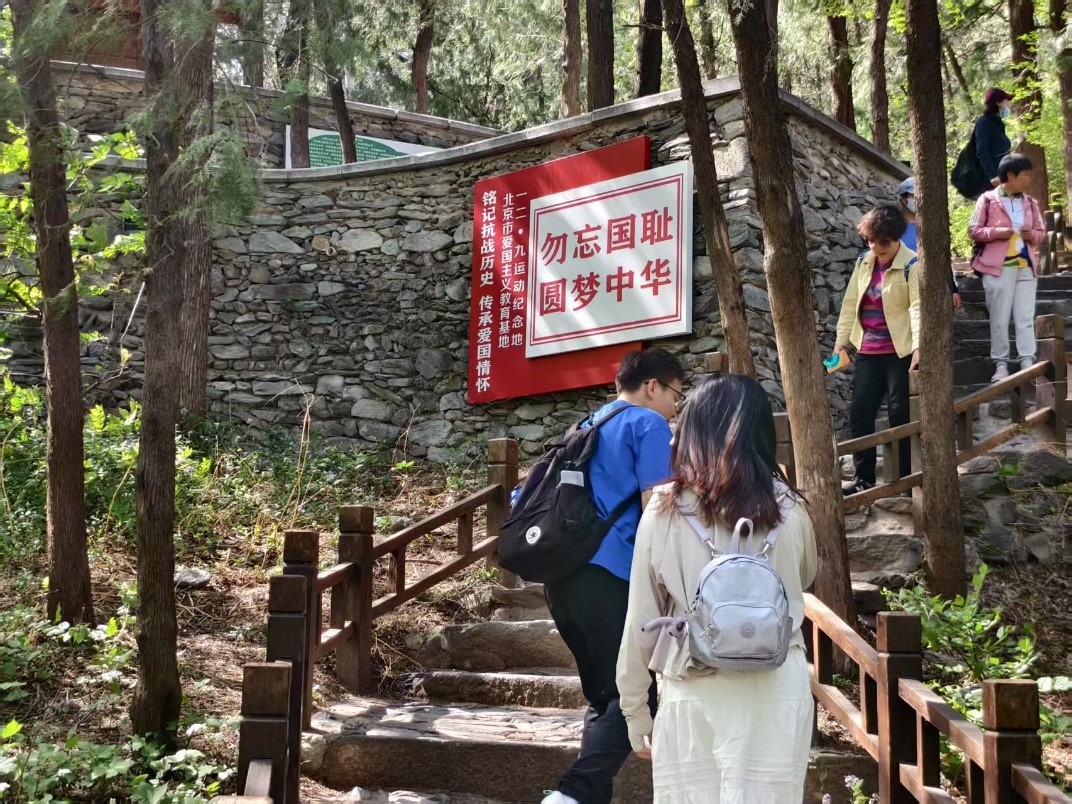 支部党员沿樱桃沟步道攀登至纪念地。行至半途,“勿忘国耻,圆梦中华”的鲜红标语赫然映入眼帘,字字铿锵有力,仿佛跨越时空的呐喊,将抗战精神与新时代青年使命紧密相连。在庄严肃穆的“一二·九运动纪念亭”前,支部书记陈喆为支部党员讲述了“一二·九”运动时期的革命历史和意义。同学们结合展板图文,深刻学习了“一二·九”运动中爱国员工冲破封锁、唤起民众觉醒的历史细节。同学们长久驻足,透过泛黄的历史照片和详实文献,追忆北平员工抗日救国示威游行的壮烈场景。党员王力宏感慨:“题展里郭明秋等革命前辈组织领导爱国员工运动的事迹,让我深刻体会到战争年代,青年学子抛头颅洒热血;当代青年与新时代同向同行,肩负民族复兴重任,我们应牢记嘱托实干笃行,牢记科技强国使命。”党支部书记陈喆表示:“作为理工科研究生,我们既要传承‘科学救国’的历史基因,更要培育‘科技报国’的时代担当。”