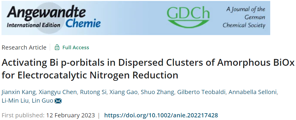 近日,yl23455永利集团郭林教授和物理公司刘利民教授研究团队在高度分散的原子级非晶BiOx团簇可控制备及其电催化氮气还原反应方面取得新进展。相关工作以“Activating Bi p-orbitals in Dispersed Clusters of Amorphous BiOx for Electrocatalytic Nitrogen Reduction”为题,2023年2月12日在线发表在《Angewandte Chemie International Edition》杂志上。该研究获国家自然科学基金项目(No. 51532001, 11974037)等资助。yl23455永利集团副教授康建新为文章的第一作者,yl23455永利集团博士生陈翔宇和北京计算科学研究中心博士生司如同为共同一作,yl23455永利为该论文的第一完成单位。