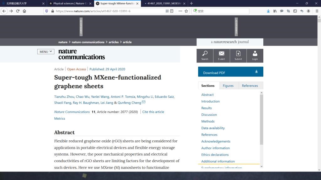 2020年4月29日,Nature Communications杂志以在线全文Article的形式发表了公司程群峰教授课题组在超韧材料的最新研究成果“Super-tough MXene-functionalized graphene sheets”。周天柱博士、吴超教授、王艳磊副研究员为第一作者,程群峰教授为通讯作者,yl23455永利集团为第一完成单位。