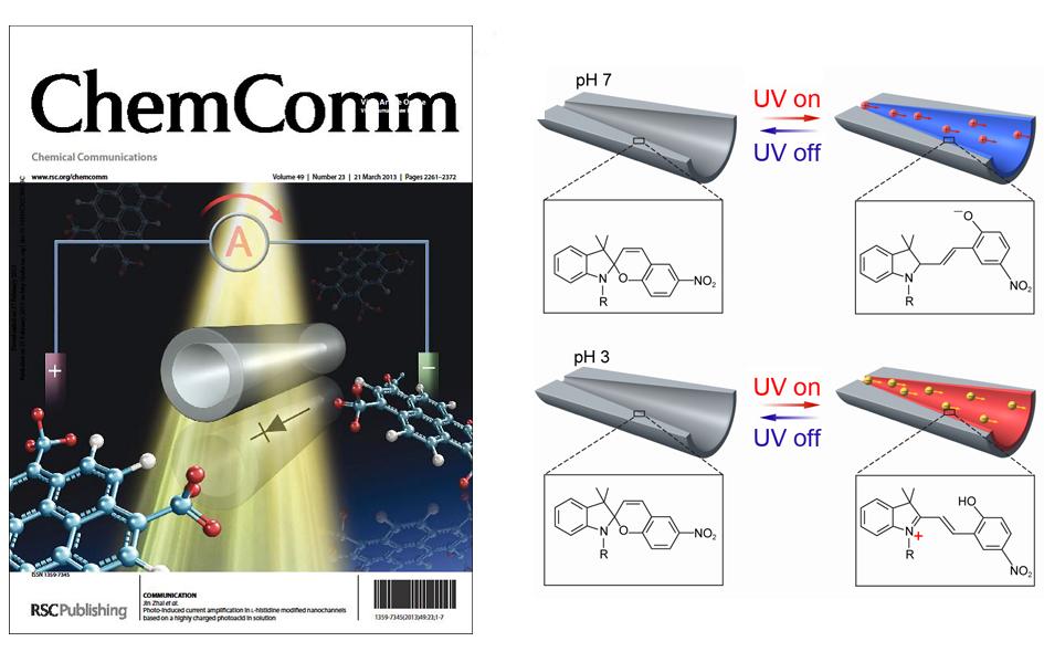 图1. 受生物原理启发利用化学手段设计智能纳米材料。(左)带电大分子在仿生纳米通道中对离子传输产生了促进作用,文章被Chemical Communication选作封面;(右)利用光致异构化分子修饰纳米孔道获得了光和pH协同响应的纳米通道。(Advanced Materials, 2012, 24, 2424-2428)