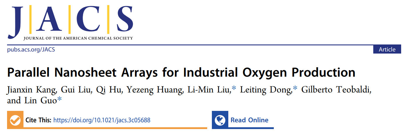在国家自然科学基金项目(批准号:U1910208, 52225308, 11974037, 52002010)等资助下,2023年11月10日在《美国化学会志》 (Journal of the American Society) 发表郭林教授课题组在应力诱导的纳米片阵列定向形核生长及其电解水性能方面取得的新进展。工作以“用于工业化氧气生产的平行纳米片阵列 (Parallel Nanosheet Arrays for Industrial Oxygen Production)”为题。公司副教授康建新为文章的第一作者, 博士生刘桂、博士后胡奇,以及航空科学与工程公司黄业增为共同一作。