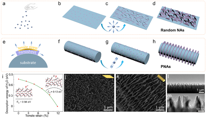 通过实验和理论计算相结合提出利用表面曲率诱导成核的机理来指导制备平行阵列。研究者首先把Ni(acac)2·2H2O分散于惰性溶剂中,进而将其高温脱水过程限制在碳纤维基底上进行,从而可以有效控制其成核长大过程。研究发现,在基底曲率的作用下,沿[100]方向的形成拉伸应变的Ni(acac)2·2H2O受到显著影响,水分子的脱附能急剧降低,从而引发Ni(acac)2的定向成核。扫描电子显微镜与透射电子显微镜等表征手段证实了所得产物为平行有序纳米阵列。不同于经典的热波动成核理论,该成核机制创新性地引入了拉应力作为形核驱动力。