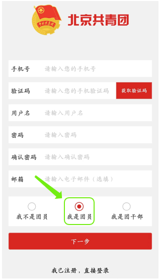 在出现的注册页面中填入相应的信息,团员用户选择“我是团员”按钮;如果用户是团干部身份,请选择“我是团干部”按钮;点击“下一步”,进入团员实名信息页;其余用户建议选择“我不是团员”,点击“注册”完成注册流程。
