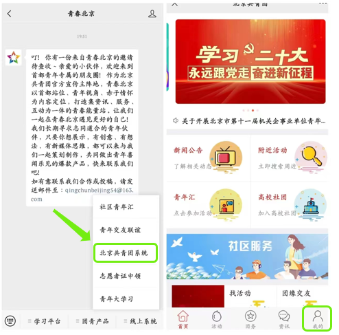 a)微信搜索“青春北京”公众号;点击“线上系统”中的“北京共青团系统”;