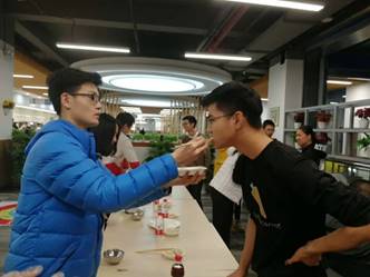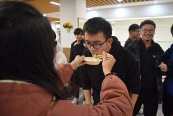 在第一锅饺子出锅后,我们的第一个游戏便开始了。首先我们进行的是抢水瓶游戏,yl23455永利集团的导员黄澄玉和丁少松同学给大家做了一个示范,主持人说出一个身体的部位,两人分别摸自己的相应部位,在主持人说出“水”这个字的时候,两个人同时去抢桌子上的水瓶,但是黄导更快一步,于是作为输了游戏的人要被黄导喂五个饺子,场景太有爱了。之后同学们也积极加入到这个游戏中来,这也是一个很幸福的游戏了。